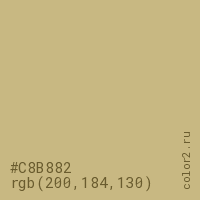 Цвет #C8B882 в цветовой модели RGB обозначается тремя октетами (200, 184, 130) в десятичном формате и #C8B882 в шестнадцатиричном (hex) формате, которые являются интенсивностью красного 200 (hex C8), интенсивность зелёного 184 (hex B8) и интенсивность синего 130 (hex 82).
