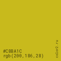 Цвет #C8BA1C в цветовой модели RGB обозначается тремя октетами (200, 186, 28) в десятичном формате и #C8BA1C в шестнадцатиричном (hex) формате, которые являются интенсивностью красного 200 (hex C8), интенсивность зелёного 186 (hex BA) и интенсивность синего 28 (hex 1C).