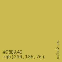 Цвет #C8BA4C в цветовой модели RGB обозначается тремя октетами (200, 186, 76) в десятичном формате и #C8BA4C в шестнадцатиричном (hex) формате, которые являются интенсивностью красного 200 (hex C8), интенсивность зелёного 186 (hex BA) и интенсивность синего 76 (hex 4C).