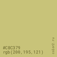 Цвет #C8C379 в цветовой модели RGB обозначается тремя октетами (200, 195, 121) в десятичном формате и #C8C379 в шестнадцатиричном (hex) формате, которые являются интенсивностью красного 200 (hex C8), интенсивность зелёного 195 (hex C3) и интенсивность синего 121 (hex 79).