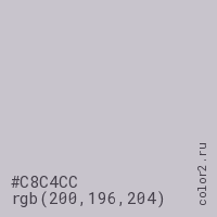 Цвет #C8C4CC в цветовой модели RGB обозначается тремя октетами (200, 196, 204) в десятичном формате и #C8C4CC в шестнадцатиричном (hex) формате, которые являются интенсивностью красного 200 (hex C8), интенсивность зелёного 196 (hex C4) и интенсивность синего 204 (hex CC).