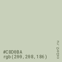 Цвет #C8D0BA в цветовой модели RGB обозначается тремя октетами (200, 208, 186) в десятичном формате и #C8D0BA в шестнадцатиричном (hex) формате, которые являются интенсивностью красного 200 (hex C8), интенсивность зелёного 208 (hex D0) и интенсивность синего 186 (hex BA).
