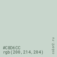 Цвет #C8D6CC в цветовой модели RGB обозначается тремя октетами (200, 214, 204) в десятичном формате и #C8D6CC в шестнадцатиричном (hex) формате, которые являются интенсивностью красного 200 (hex C8), интенсивность зелёного 214 (hex D6) и интенсивность синего 204 (hex CC).