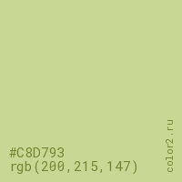 Цвет #C8D793 в цветовой модели RGB обозначается тремя октетами (200, 215, 147) в десятичном формате и #C8D793 в шестнадцатиричном (hex) формате, которые являются интенсивностью красного 200 (hex C8), интенсивность зелёного 215 (hex D7) и интенсивность синего 147 (hex 93).