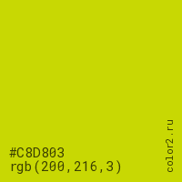 Цвет #C8D803 в цветовой модели RGB обозначается тремя октетами (200, 216, 3) в десятичном формате и #C8D803 в шестнадцатиричном (hex) формате, которые являются интенсивностью красного 200 (hex C8), интенсивность зелёного 216 (hex D8) и интенсивность синего 3 (hex 03).