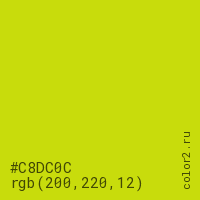 Цвет #C8DC0C в цветовой модели RGB обозначается тремя октетами (200, 220, 12) в десятичном формате и #C8DC0C в шестнадцатиричном (hex) формате, которые являются интенсивностью красного 200 (hex C8), интенсивность зелёного 220 (hex DC) и интенсивность синего 12 (hex 0C).