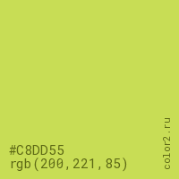 Цвет #C8DD55 в цветовой модели RGB обозначается тремя октетами (200, 221, 85) в десятичном формате и #C8DD55 в шестнадцатиричном (hex) формате, которые являются интенсивностью красного 200 (hex C8), интенсивность зелёного 221 (hex DD) и интенсивность синего 85 (hex 55).