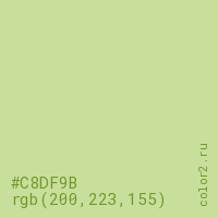Цвет #C8DF9B в цветовой модели RGB обозначается тремя октетами (200, 223, 155) в десятичном формате и #C8DF9B в шестнадцатиричном (hex) формате, которые являются интенсивностью красного 200 (hex C8), интенсивность зелёного 223 (hex DF) и интенсивность синего 155 (hex 9B).