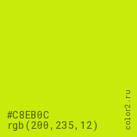 Цвет #C8EB0C в цветовой модели RGB обозначается тремя октетами (200, 235, 12) в десятичном формате и #C8EB0C в шестнадцатиричном (hex) формате, которые являются интенсивностью красного 200 (hex C8), интенсивность зелёного 235 (hex EB) и интенсивность синего 12 (hex 0C).