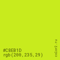Цвет #C8EB1D в цветовой модели RGB обозначается тремя октетами (200, 235, 29) в десятичном формате и #C8EB1D в шестнадцатиричном (hex) формате, которые являются интенсивностью красного 200 (hex C8), интенсивность зелёного 235 (hex EB) и интенсивность синего 29 (hex 1D).