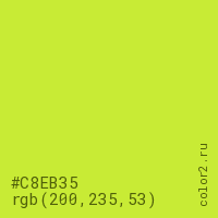 Цвет #C8EB35 в цветовой модели RGB обозначается тремя октетами (200, 235, 53) в десятичном формате и #C8EB35 в шестнадцатиричном (hex) формате, которые являются интенсивностью красного 200 (hex C8), интенсивность зелёного 235 (hex EB) и интенсивность синего 53 (hex 35).