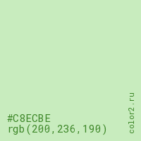 Цвет #C8ECBE в цветовой модели RGB обозначается тремя октетами (200, 236, 190) в десятичном формате и #C8ECBE в шестнадцатиричном (hex) формате, которые являются интенсивностью красного 200 (hex C8), интенсивность зелёного 236 (hex EC) и интенсивность синего 190 (hex BE).