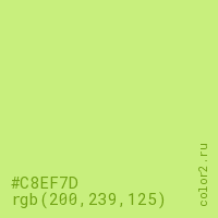 Цвет #C8EF7D в цветовой модели RGB обозначается тремя октетами (200, 239, 125) в десятичном формате и #C8EF7D в шестнадцатиричном (hex) формате, которые являются интенсивностью красного 200 (hex C8), интенсивность зелёного 239 (hex EF) и интенсивность синего 125 (hex 7D).