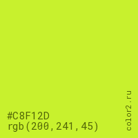 Цвет #C8F12D в цветовой модели RGB обозначается тремя октетами (200, 241, 45) в десятичном формате и #C8F12D в шестнадцатиричном (hex) формате, которые являются интенсивностью красного 200 (hex C8), интенсивность зелёного 241 (hex F1) и интенсивность синего 45 (hex 2D).