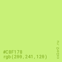 Цвет #C8F178 в цветовой модели RGB обозначается тремя октетами (200, 241, 120) в десятичном формате и #C8F178 в шестнадцатиричном (hex) формате, которые являются интенсивностью красного 200 (hex C8), интенсивность зелёного 241 (hex F1) и интенсивность синего 120 (hex 78).