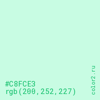 Цвет #C8FCE3 в цветовой модели RGB обозначается тремя октетами (200, 252, 227) в десятичном формате и #C8FCE3 в шестнадцатиричном (hex) формате, которые являются интенсивностью красного 200 (hex C8), интенсивность зелёного 252 (hex FC) и интенсивность синего 227 (hex E3).