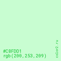 Цвет #C8FDD1 в цветовой модели RGB обозначается тремя октетами (200, 253, 209) в десятичном формате и #C8FDD1 в шестнадцатиричном (hex) формате, которые являются интенсивностью красного 200 (hex C8), интенсивность зелёного 253 (hex FD) и интенсивность синего 209 (hex D1).