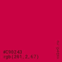 Цвет #C90243 в цветовой модели RGB обозначается тремя октетами (201, 2, 67) в десятичном формате и #C90243 в шестнадцатиричном (hex) формате, которые являются интенсивностью красного 201 (hex C9), интенсивность зелёного 2 (hex 02) и интенсивность синего 67 (hex 43).