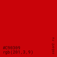 Цвет #C90309 в цветовой модели RGB обозначается тремя октетами (201, 3, 9) в десятичном формате и #C90309 в шестнадцатиричном (hex) формате, которые являются интенсивностью красного 201 (hex C9), интенсивность зелёного 3 (hex 03) и интенсивность синего 9 (hex 09).