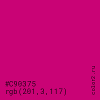 Цвет #C90375 в цветовой модели RGB обозначается тремя октетами (201, 3, 117) в десятичном формате и #C90375 в шестнадцатиричном (hex) формате, которые являются интенсивностью красного 201 (hex C9), интенсивность зелёного 3 (hex 03) и интенсивность синего 117 (hex 75).