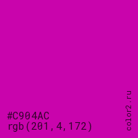 Цвет #C904AC в цветовой модели RGB обозначается тремя октетами (201, 4, 172) в десятичном формате и #C904AC в шестнадцатиричном (hex) формате, которые являются интенсивностью красного 201 (hex C9), интенсивность зелёного 4 (hex 04) и интенсивность синего 172 (hex AC).