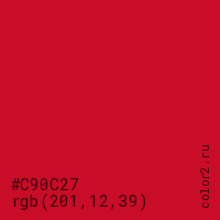 Цвет #C90C27 в цветовой модели RGB обозначается тремя октетами (201, 12, 39) в десятичном формате и #C90C27 в шестнадцатиричном (hex) формате, которые являются интенсивностью красного 201 (hex C9), интенсивность зелёного 12 (hex 0C) и интенсивность синего 39 (hex 27).