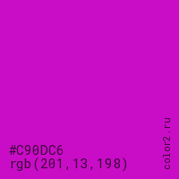 Цвет #C90DC6 в цветовой модели RGB обозначается тремя октетами (201, 13, 198) в десятичном формате и #C90DC6 в шестнадцатиричном (hex) формате, которые являются интенсивностью красного 201 (hex C9), интенсивность зелёного 13 (hex 0D) и интенсивность синего 198 (hex C6).