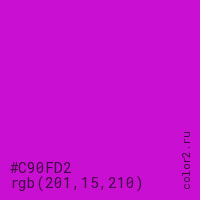 Цвет #C90FD2 в цветовой модели RGB обозначается тремя октетами (201, 15, 210) в десятичном формате и #C90FD2 в шестнадцатиричном (hex) формате, которые являются интенсивностью красного 201 (hex C9), интенсивность зелёного 15 (hex 0F) и интенсивность синего 210 (hex D2).