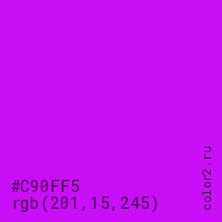 Цвет #C90FF5 в цветовой модели RGB обозначается тремя октетами (201, 15, 245) в десятичном формате и #C90FF5 в шестнадцатиричном (hex) формате, которые являются интенсивностью красного 201 (hex C9), интенсивность зелёного 15 (hex 0F) и интенсивность синего 245 (hex F5).