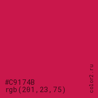 Цвет #C9174B в цветовой модели RGB обозначается тремя октетами (201, 23, 75) в десятичном формате и #C9174B в шестнадцатиричном (hex) формате, которые являются интенсивностью красного 201 (hex C9), интенсивность зелёного 23 (hex 17) и интенсивность синего 75 (hex 4B).