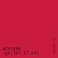Цвет #C91B40 в цветовой модели RGB обозначается тремя октетами (201, 27, 64) в десятичном формате и #C91B40 в шестнадцатиричном (hex) формате, которые являются интенсивностью красного 201 (hex C9), интенсивность зелёного 27 (hex 1B) и интенсивность синего 64 (hex 40).