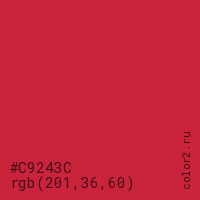 Цвет #C9243C в цветовой модели RGB обозначается тремя октетами (201, 36, 60) в десятичном формате и #C9243C в шестнадцатиричном (hex) формате, которые являются интенсивностью красного 201 (hex C9), интенсивность зелёного 36 (hex 24) и интенсивность синего 60 (hex 3C).