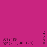 Цвет #C92480 в цветовой модели RGB обозначается тремя октетами (201, 36, 128) в десятичном формате и #C92480 в шестнадцатиричном (hex) формате, которые являются интенсивностью красного 201 (hex C9), интенсивность зелёного 36 (hex 24) и интенсивность синего 128 (hex 80).
