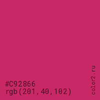 Цвет #C92866 в цветовой модели RGB обозначается тремя октетами (201, 40, 102) в десятичном формате и #C92866 в шестнадцатиричном (hex) формате, которые являются интенсивностью красного 201 (hex C9), интенсивность зелёного 40 (hex 28) и интенсивность синего 102 (hex 66).