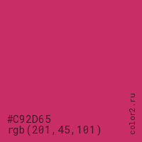 Цвет #C92D65 в цветовой модели RGB обозначается тремя октетами (201, 45, 101) в десятичном формате и #C92D65 в шестнадцатиричном (hex) формате, которые являются интенсивностью красного 201 (hex C9), интенсивность зелёного 45 (hex 2D) и интенсивность синего 101 (hex 65).