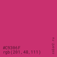 Цвет #C9306F в цветовой модели RGB обозначается тремя октетами (201, 48, 111) в десятичном формате и #C9306F в шестнадцатиричном (hex) формате, которые являются интенсивностью красного 201 (hex C9), интенсивность зелёного 48 (hex 30) и интенсивность синего 111 (hex 6F).