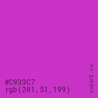 Цвет #C933C7 в цветовой модели RGB обозначается тремя октетами (201, 51, 199) в десятичном формате и #C933C7 в шестнадцатиричном (hex) формате, которые являются интенсивностью красного 201 (hex C9), интенсивность зелёного 51 (hex 33) и интенсивность синего 199 (hex C7).