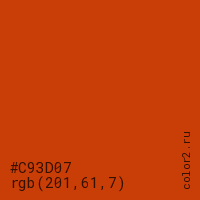 Цвет #C93D07 в цветовой модели RGB обозначается тремя октетами (201, 61, 7) в десятичном формате и #C93D07 в шестнадцатиричном (hex) формате, которые являются интенсивностью красного 201 (hex C9), интенсивность зелёного 61 (hex 3D) и интенсивность синего 7 (hex 07).