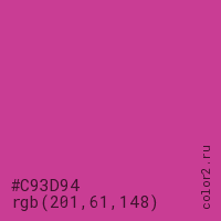 Цвет #C93D94 в цветовой модели RGB обозначается тремя октетами (201, 61, 148) в десятичном формате и #C93D94 в шестнадцатиричном (hex) формате, которые являются интенсивностью красного 201 (hex C9), интенсивность зелёного 61 (hex 3D) и интенсивность синего 148 (hex 94).