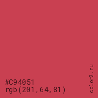 Цвет #C94051 в цветовой модели RGB обозначается тремя октетами (201, 64, 81) в десятичном формате и #C94051 в шестнадцатиричном (hex) формате, которые являются интенсивностью красного 201 (hex C9), интенсивность зелёного 64 (hex 40) и интенсивность синего 81 (hex 51).