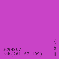 Цвет #C943C7 в цветовой модели RGB обозначается тремя октетами (201, 67, 199) в десятичном формате и #C943C7 в шестнадцатиричном (hex) формате, которые являются интенсивностью красного 201 (hex C9), интенсивность зелёного 67 (hex 43) и интенсивность синего 199 (hex C7).