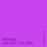 Цвет #C944EE в цветовой модели RGB обозначается тремя октетами (201, 68, 238) в десятичном формате и #C944EE в шестнадцатиричном (hex) формате, которые являются интенсивностью красного 201 (hex C9), интенсивность зелёного 68 (hex 44) и интенсивность синего 238 (hex EE).