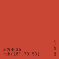 Цвет #C94635 в цветовой модели RGB обозначается тремя октетами (201, 70, 53) в десятичном формате и #C94635 в шестнадцатиричном (hex) формате, которые являются интенсивностью красного 201 (hex C9), интенсивность зелёного 70 (hex 46) и интенсивность синего 53 (hex 35).