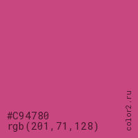 Цвет #C94780 в цветовой модели RGB обозначается тремя октетами (201, 71, 128) в десятичном формате и #C94780 в шестнадцатиричном (hex) формате, которые являются интенсивностью красного 201 (hex C9), интенсивность зелёного 71 (hex 47) и интенсивность синего 128 (hex 80).