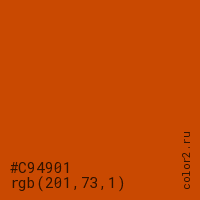 Цвет #C94901 в цветовой модели RGB обозначается тремя октетами (201, 73, 1) в десятичном формате и #C94901 в шестнадцатиричном (hex) формате, которые являются интенсивностью красного 201 (hex C9), интенсивность зелёного 73 (hex 49) и интенсивность синего 1 (hex 01).