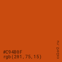 Цвет #C94B0F в цветовой модели RGB обозначается тремя октетами (201, 75, 15) в десятичном формате и #C94B0F в шестнадцатиричном (hex) формате, которые являются интенсивностью красного 201 (hex C9), интенсивность зелёного 75 (hex 4B) и интенсивность синего 15 (hex 0F).