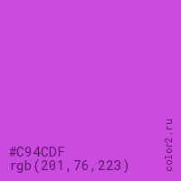 Цвет #C94CDF в цветовой модели RGB обозначается тремя октетами (201, 76, 223) в десятичном формате и #C94CDF в шестнадцатиричном (hex) формате, которые являются интенсивностью красного 201 (hex C9), интенсивность зелёного 76 (hex 4C) и интенсивность синего 223 (hex DF).