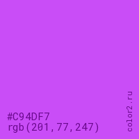 Цвет #C94DF7 в цветовой модели RGB обозначается тремя октетами (201, 77, 247) в десятичном формате и #C94DF7 в шестнадцатиричном (hex) формате, которые являются интенсивностью красного 201 (hex C9), интенсивность зелёного 77 (hex 4D) и интенсивность синего 247 (hex F7).
