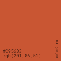 Цвет #C95633 в цветовой модели RGB обозначается тремя октетами (201, 86, 51) в десятичном формате и #C95633 в шестнадцатиричном (hex) формате, которые являются интенсивностью красного 201 (hex C9), интенсивность зелёного 86 (hex 56) и интенсивность синего 51 (hex 33).