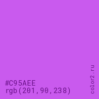 Цвет #C95AEE в цветовой модели RGB обозначается тремя октетами (201, 90, 238) в десятичном формате и #C95AEE в шестнадцатиричном (hex) формате, которые являются интенсивностью красного 201 (hex C9), интенсивность зелёного 90 (hex 5A) и интенсивность синего 238 (hex EE).